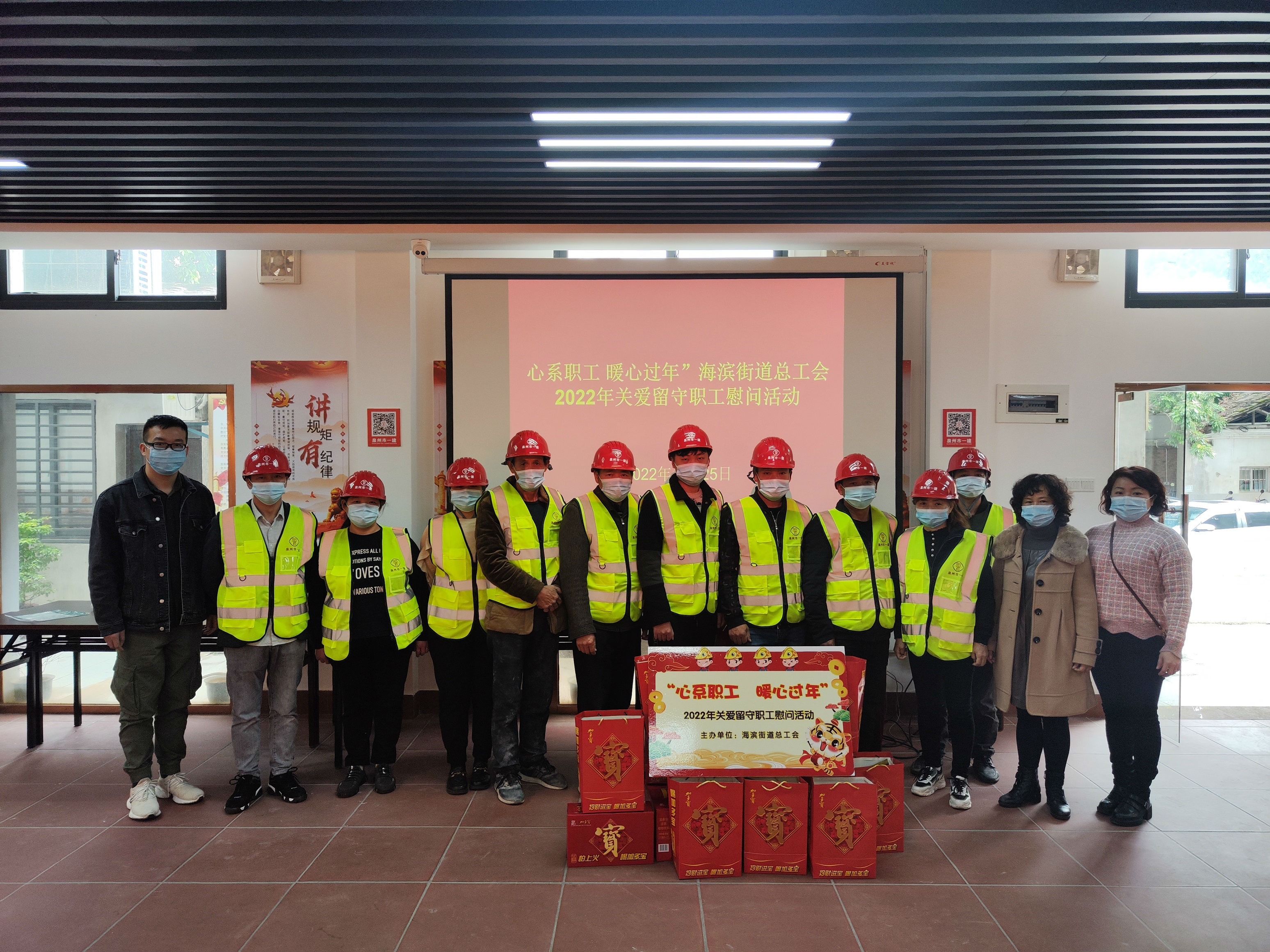 为响应国家疫情防控号召,提倡就地过春节,鼓励省外来鲤务工人员留鲤过年,春节前夕,福建省泉州市第一建设有限公司联合所在地海滨街道办事处,开展“心系职工 暖心过年”2022年关爱留守职工慰问活动。